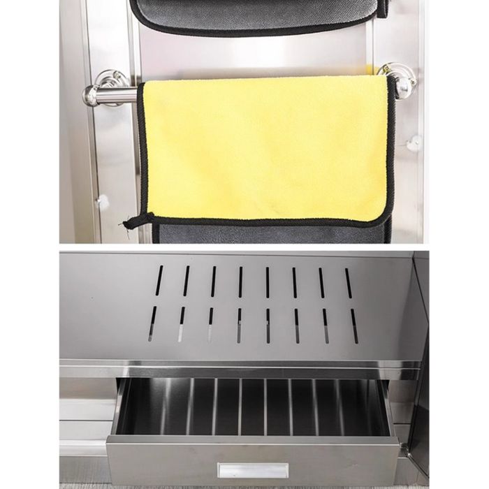 قم بتنظيم مساحتك بمرونة مع منظم ستانلس ستيل متعدد الإستخدامات مع باب بقفل، مصنوع من ستانلس ستيل مقاوم للرطوبة، مناسب للحمام أو المطبخ، يضم درجاً داخلياً وأرفف تعليق مدمجة بالباب لتنظيم وتعليق أدوات التنظيف