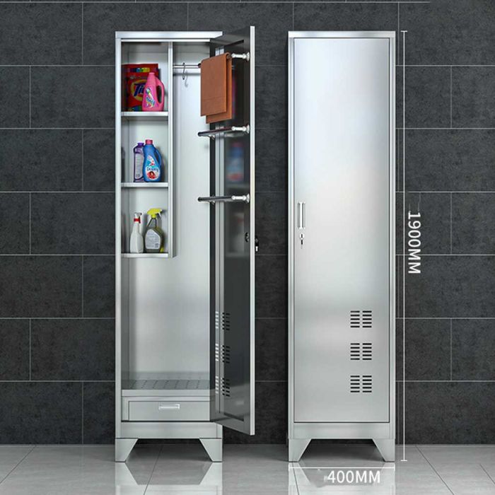 قم بتنظيم مساحتك بمرونة مع منظم ستانلس ستيل متعدد الإستخدامات مع باب بقفل، مصنوع من ستانلس ستيل مقاوم للرطوبة، مناسب للحمام أو المطبخ، يضم درجاً داخلياً وأرفف تعليق مدمجة بالباب لتنظيم وتعليق أدوات التنظيف