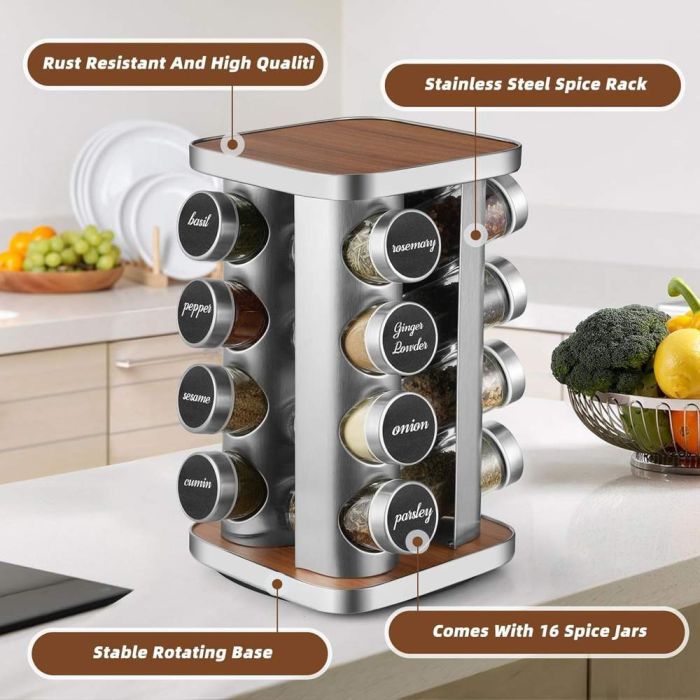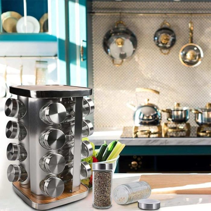 احفظ توابلك بشكل أنيق ومرتب مع دوّار عملي مزود بـ 16 مرطبان صغير. تصميم عصري من الستانلس يضيف لمسة فاخرة لمطبخك ويسهّل الوصول لكل النكهات.