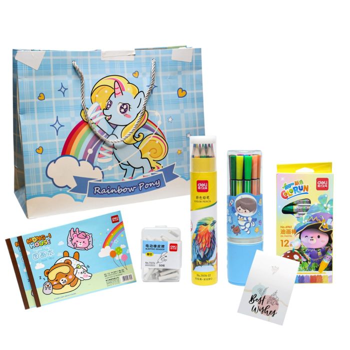 - تشتمل على فرش ألوان مائية، فرش ألوان زيتية، كتب مصورة، أقلام تلوين