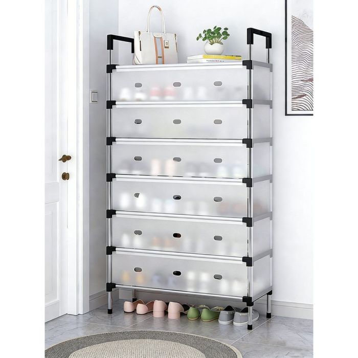 رف الأحذية السداسي بالغطاء يمنحك سعة تخزين أكبر لأحذيتك بست طبقات فولاذية محمية بغطاء متين يحافظ عليها من الغبار ويمنح مساحة منزلك طابعاً منظماً وأنيقاً في آنٍ واحد