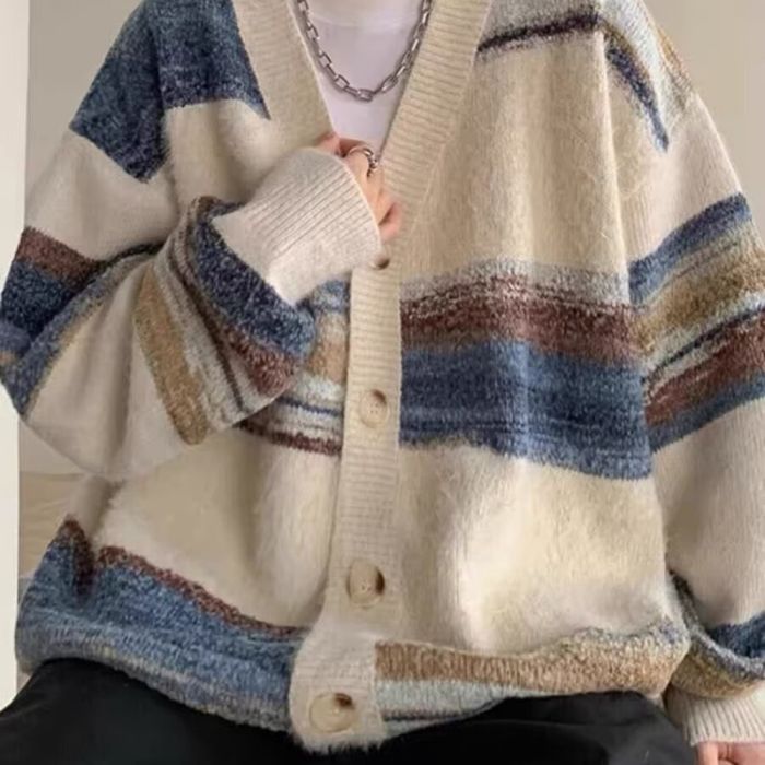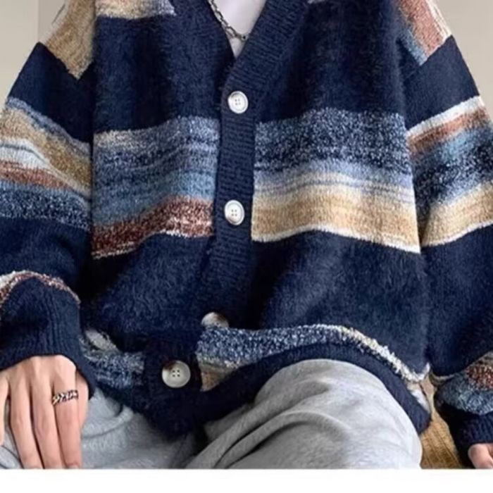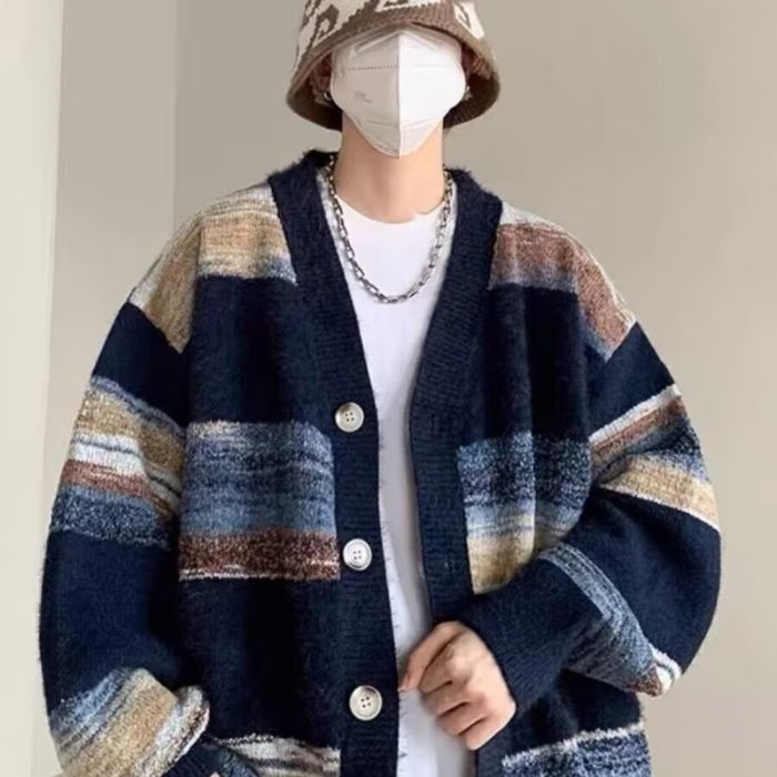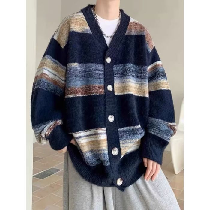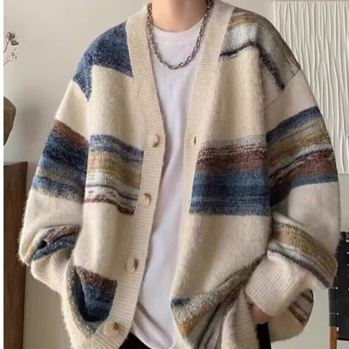 كارديجان محبوك مخطط للرجال مصنوع من نسيج محبوك ناعم، يمنح إطلالة كاجوال دافئة بأسلوب عصري مريح، تصميمه الفضفاض ينساب بسهولة ويناسب التنسيق اليومي، مثالي لفصلَي الخريف والشتاء، يوفر راحة أنيقة مع الحفاظ على جودته