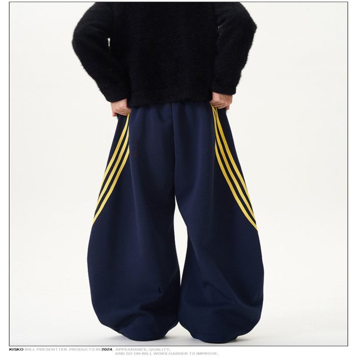 بنطلون واسع مخطط بخصر مطاطي للرجال مصنوع من مزيج مريح، يوفر مظهراً جمالياً عصرياً يعكس نمط الشارع الأمريكي، بتصميم فضفاض وحبل شد مرن لراحة فائقة وتناسق فريد.