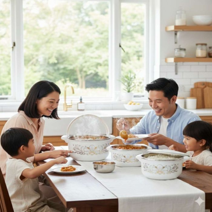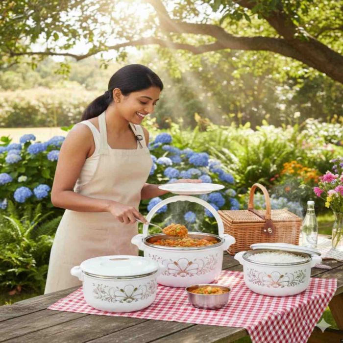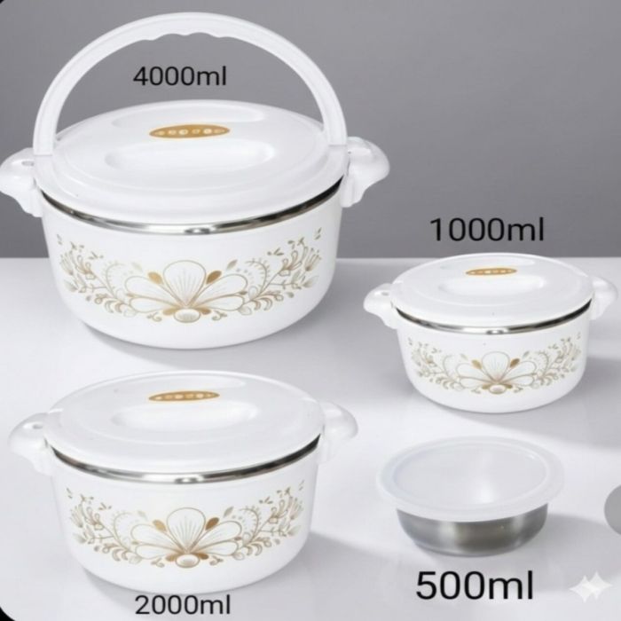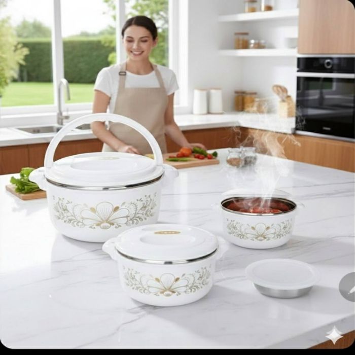 صُمم هذا الطقم لتوفير احتفاظ ممتاز بدرجة الحرارة وسهولة الاستخدام اليومية بفضل هيكله المزدوج المعزول وداخله المصنوع من الستانلس ستيل. تساعد الحافظات على بقاء الطعام ساخناً أو بارداً لساعات مع الحفاظ على النكهة والرائحة والقيمة الغذائية دون الحاجة لإعادة التسخين، مما يجعلها مثالية للاستخدام المنزلي والولائم ونقل الطعام. يوفر الغطاء المحكم والهيكل الخارجي المتين والمقابض المقاومة للحرارة راحة وثباتاً أثناء الحمل والتقديم.