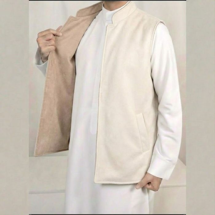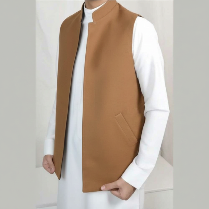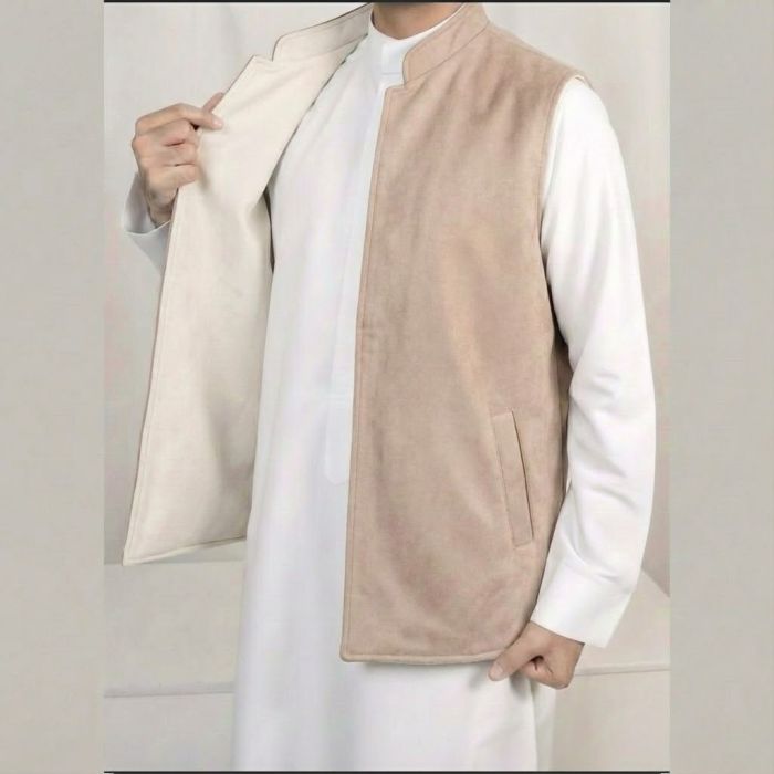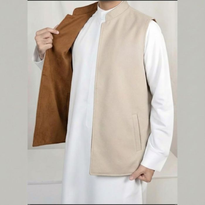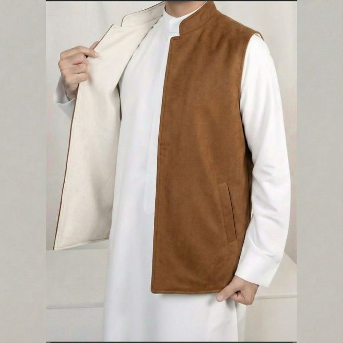 تميّز بإطلالة فريدة مع هذا الجاكيت الرجالي الأنيق بدون أكمام، المصمم بوجهين ليمنحك خيارات متعددة في التنسيق. يأتي بقصة عصرية مستوحاة من الزي التقليدي، مع ياقة عالية (ستايل Mandarin) وجيوب جانبية عملية تضيف لمسة من الأناقة والوظيفة. الجاكيت مصنوع من خامات مريحة وعالية الجودة، ويتميز ببطانة داخلية بلون متناسق، مما يجعله مثاليًا للارتداء فوق الثوب أو القميص في المناسبات الرسمية أو الإطلالات اليومية.