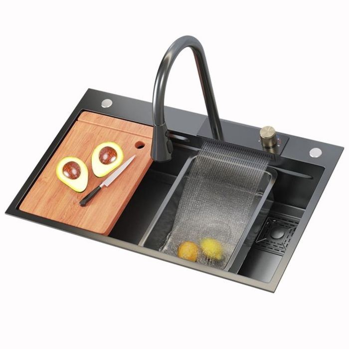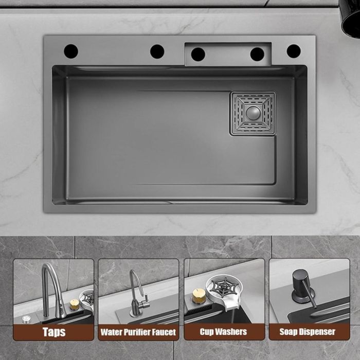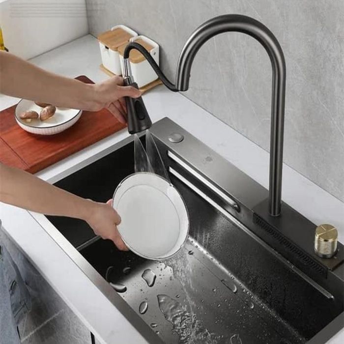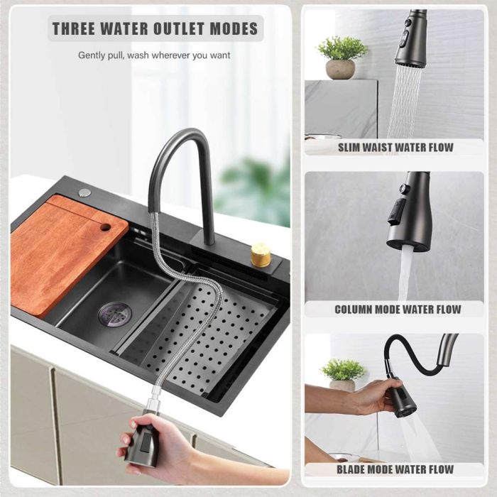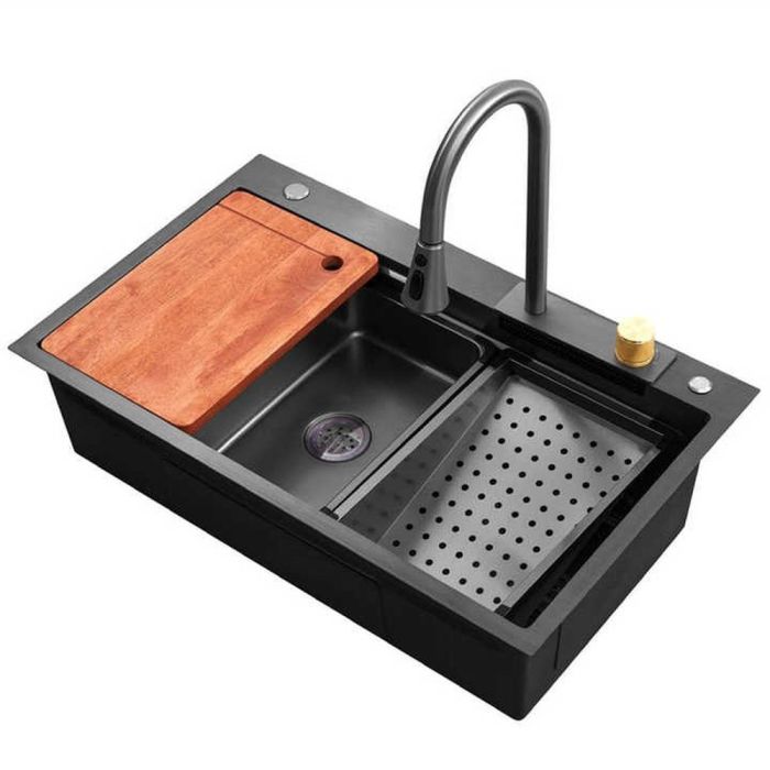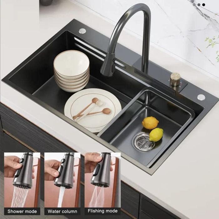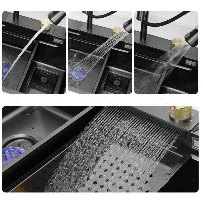 حوض مطبخ ذو سعة كبيرة ولمسة مصقولة بتقنية النانو. مصنوع من ستانلس ستيل سميك مقاوم للخدوش والصدمات، ومجهز بصنبور قابل للتمدد بثلاثة أوضاع لرش المياه مع وضع شلال، إضافة إلى حوض غسيل داخلي، حوض تصريف، ولوح تقطيع متحرك، وإمكانية تركيب ملحقات إضافية لمزيد من الراحة