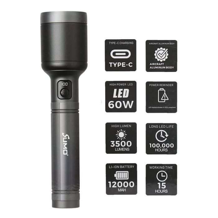 كشاف قوي بإضاءة عالية حتى 3500 لومن مع بطارية كبيرة ووضعيات تشغيل متعددة للاستخدام الخارجي والطوارئ.
