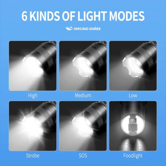 - الأوضاع: قوي، متوسط، ضعيف، وميض، SOS، إضاءة خلفية COB.