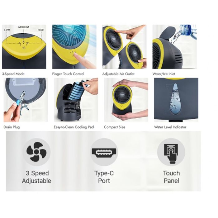 تغلب على الحر بأناقة مع مبرد الهواء المحمول سيمفوني. صغير الحجم وقوي، يوفر هواءً باردًا ومنعشًا أينما احتجت إليه بفضل موزع الهواء ثنائي الاتجاه، ومقبضه المريح، وسهولة حمله. مصمم لتوفير الراحة، مع مؤشر مستوى الماء، ووسادة تبريد قابلة للإزالة، وأداء هادئ، مثالي للمنزل، والمكتب، وحتى أثناء السفر.