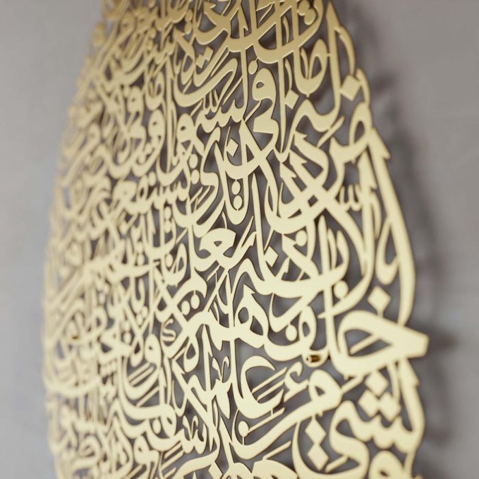 تُعد تحفة فنية بخط عربي أصيل، تحمل آية الكرسي من القرآن الكريم. صُنعت من معدن عالي الجودة لتدوم طويلاً، وتضفي على المكان شعورًا بالسكينة والإيمان والحماية. يتميز النقش بجماله ودقته، ليكون تذكارًا روحانيًا وقطعة فنية مميزة في الوقت نفسه. مثالية لغرف المعيشة، المكاتب، أو أماكن الصلاة، حيث تضفي لمسة من الجلال والروحانية.