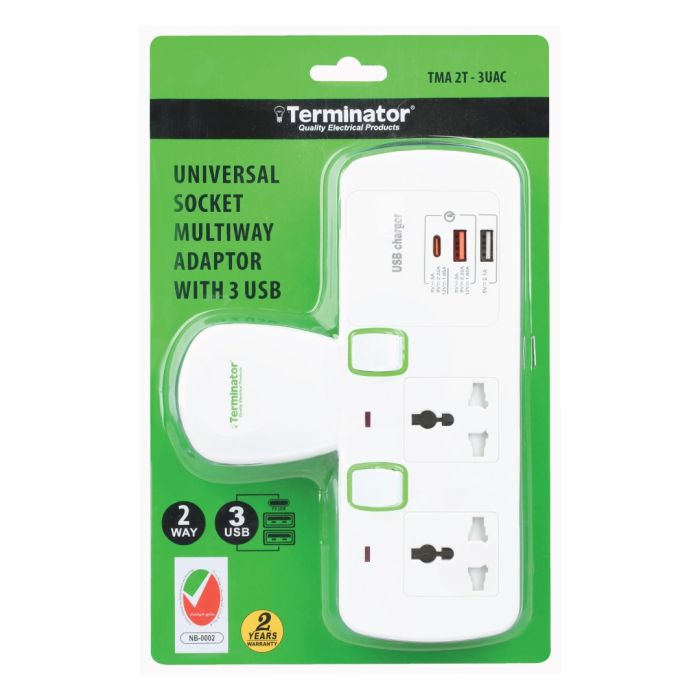 - محول كهربائي 2 مخرج على شكل حرف T مع 3 منافذ USB من Terminator
