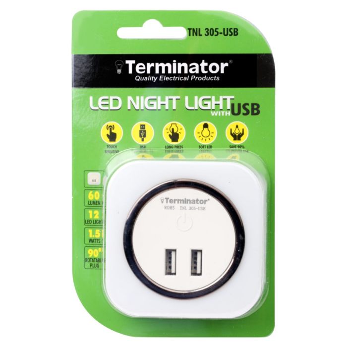 - إضاءة ليلية LED مع 2 منفذ USB من Terminator - أبيض