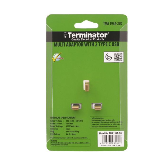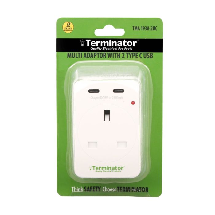 - محول كهربائي إنجليزي 3 مخارج 2 منفذ USB-C من Terminator - أبيض