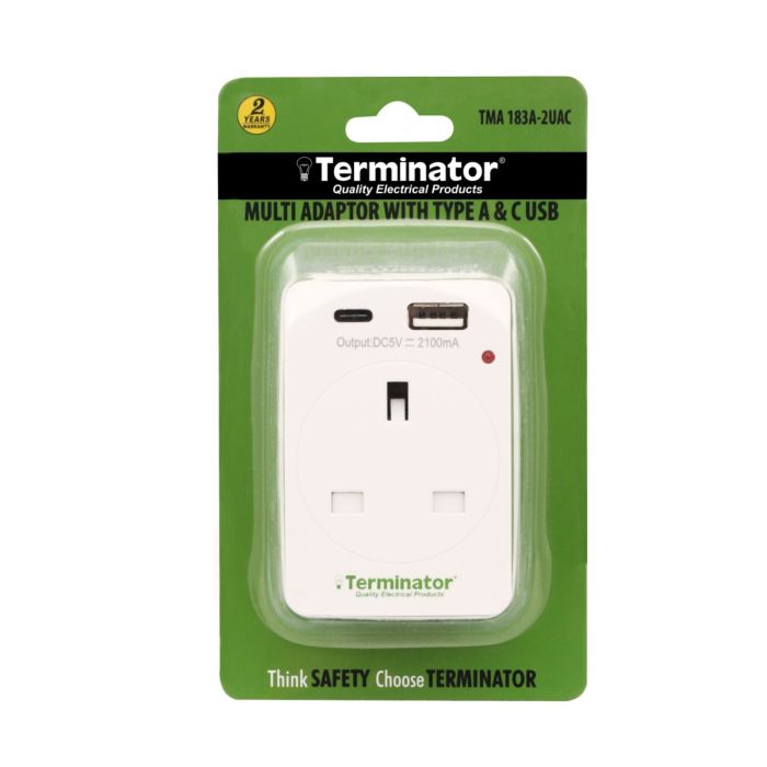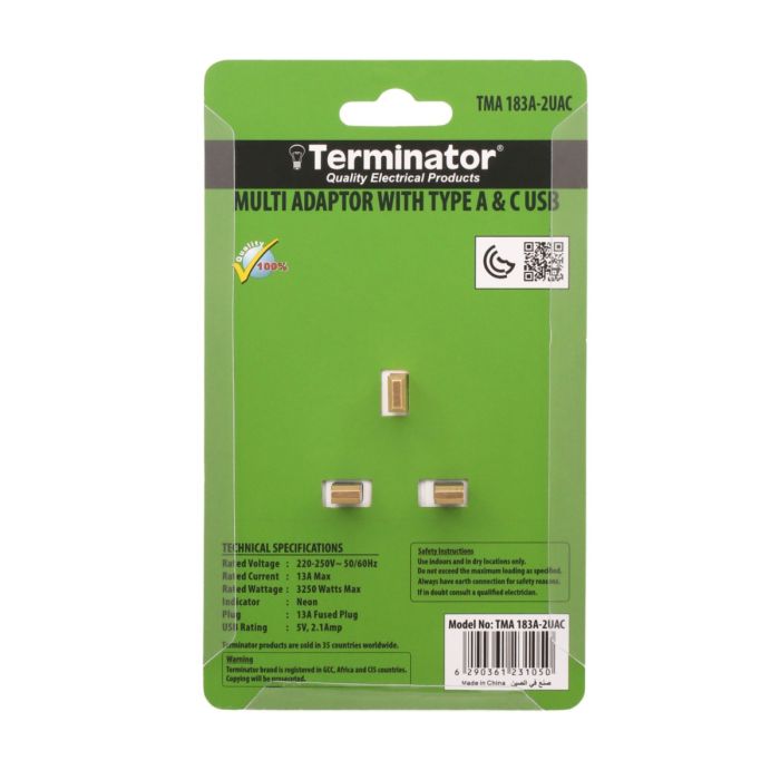TMA 183A-2UACBrand: TerminatorModel: TMA 183A-2UACDescription: 3 Way UK Socket Multi AdaptorCountry of Origin: China3 Way UK Socket Multi Adaptor with 2 USB (A & C Type) 2.1A, Indicator and 13A Fused Plug