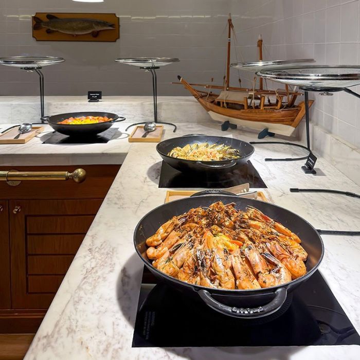 يوميا أنتم على موعد مع بوفيه للغداء او العشاء من أشهى المأكولات البحرية الطّازجة في مطعم النوخذة فرع فندق كراون بلازا الفروانية وتمتعوا بأفخر أنواع الأسماك والروبيان بالإضافة الى السلطات والشوربة والحلويات.