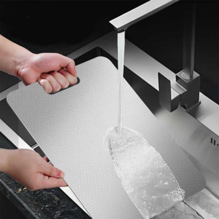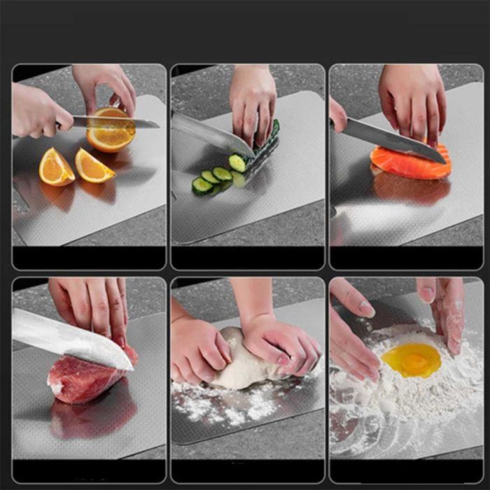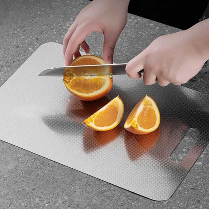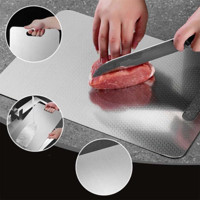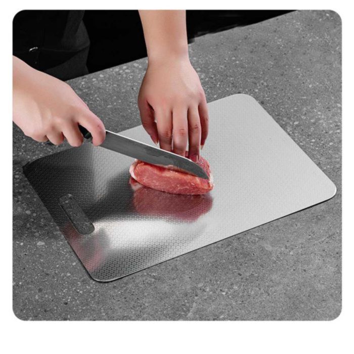 لوح تقطيع ستانلس ستيل سميك يتميز بتصميم متين، يوفر سطح تقطيع ناعم، يوزع الضغط بشكل متوازن، يساعد في الحفاظ على حدة السكاكين، ومناسب للمطابخ العصرية بلمسة أنيقة.