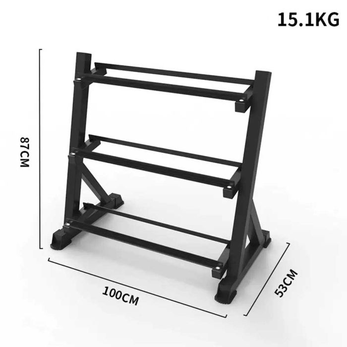 قاعدة دمبل 3 طبقات سعة 8 أزواج مصنوعة من فولاذ مقوى بسماكة 3 مم تمنح ثباتًا فائقًا وتحملًا عاليًا للأوزان، مزودة بوسادات مطاطية سفلية لحماية الأرضية من الخدوش والانزلاق، وتصميم مائل يسهل ترتيب الدمبلز بطريقة آمنة ومنظمة، مما يجعلها مثالية لتنظيم مساحة التمرين بكفاءة.