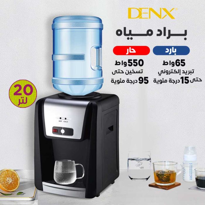 أحصل على مياه باردة وساخنة في أي وقت مع براد المياه من Denx، فهو مصمم لتلبية احتياجاتك اليومية بكفاءة وأمان. يتميز بنظام تبريد إلكتروني بقوة 65 واط ويوفر تبريداً بمعدل 0.7 لتر في الساعة، وتسخين بقوة 550 واط ليوفر حتى 5 لتر من الماء الساخن كل ساعة. كما يدعم عبوات الماء سعة 11 و19 لتر مع تعبئة علوية سهلة، كما أنه مزوّد بأنابيب من السيليكون الآمن غذائياً لضمان أقصى درجات النظافة والسلامة، مما يجعله مثالياً للاستخدام في المنزل والمكتب