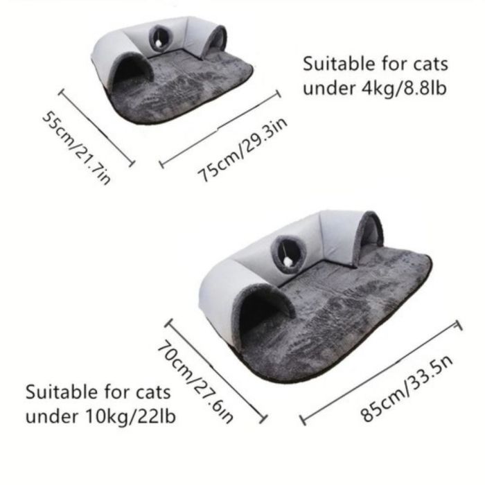 سرير ونفق لعب للقطط شكل حرف U مصنوع من خامات ناعمة مريحة، يجمع بين مساحة نوم دافئة ونفق تفاعلي للعب، تصميم مبتكر يحفز الحركة والاستكشاف، يمنح قطتك راحة ومتعة يومية داخل المنزل
