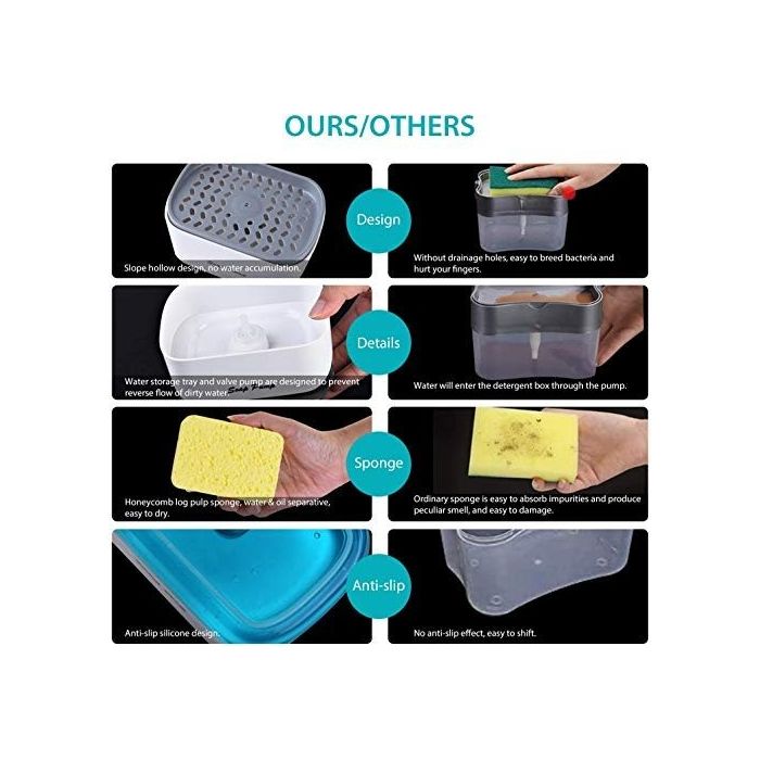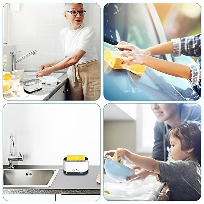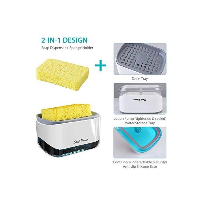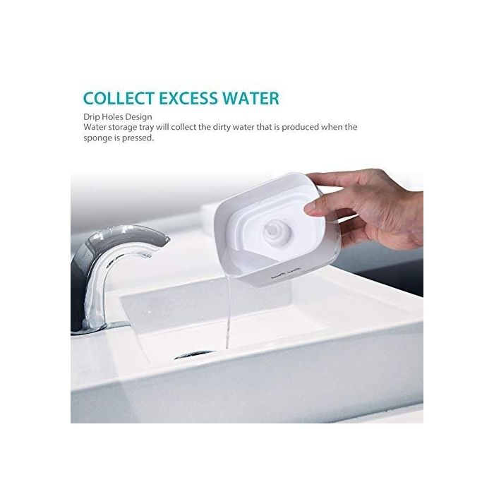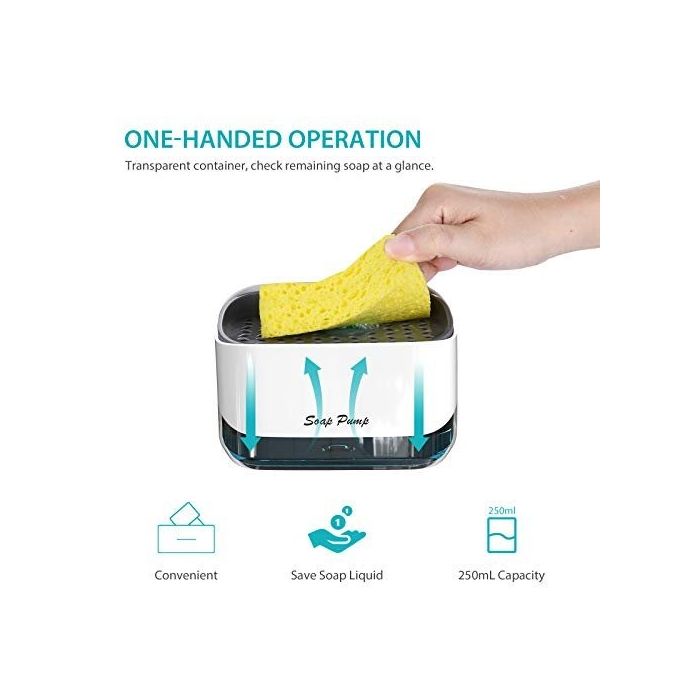 - يجمع بين موزع الصابون وقاعدة الإسفنجة، مما يوفر المساحة ويمنع تراكم المياه على الأسطح