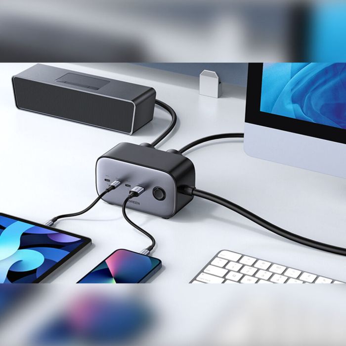 شغل جميع أجهزتك بسهولة مع وصلة الطاقة UGREEN. تتميز هذه الوصلة المدمجة بثلاثة منافذ USB-C، ومنفذ USB-A، ومنفذين تيار متردد، ما يسمح بشحن ما يصل إلى ستة أجهزة، بما في ذلك أجهزة اللابتوب والهواتف الذكية وغيرها. مزودة بتقنية GaN II، توفر شحنًا سريعًا وآمنًا بتصميم أنيق ومناسب لسطح الطاولة.