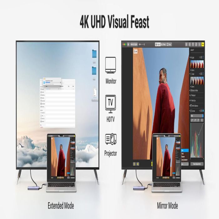 محول USB-C متعدد المنافذ لتحويل منفذ USB-C واحد إلى مركز توصيل متكامل. يتيح لك توصيل شاشة خارجية بدقة عالية عبر HDMI، إلى جانب توصيل وحدات التخزين والأجهزة الاخرى بسهولة. يوفر أداءً مستقراً ونقل بيانات سريع، مع تصميم أنيق وخامات عالية الجودة تناسب الاستخدام اليومي في العمل، الدراسة، أو أثناء التنقل.