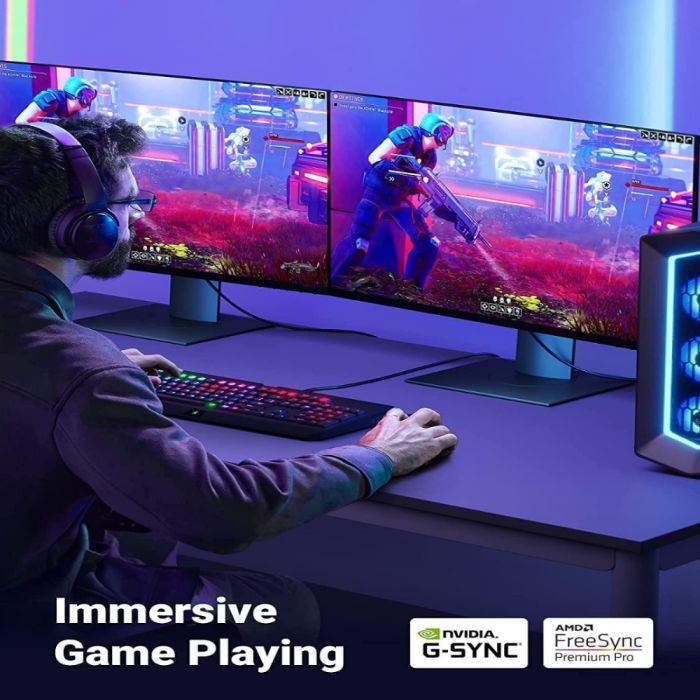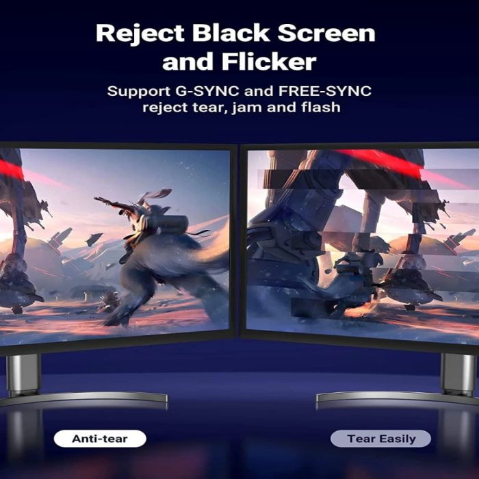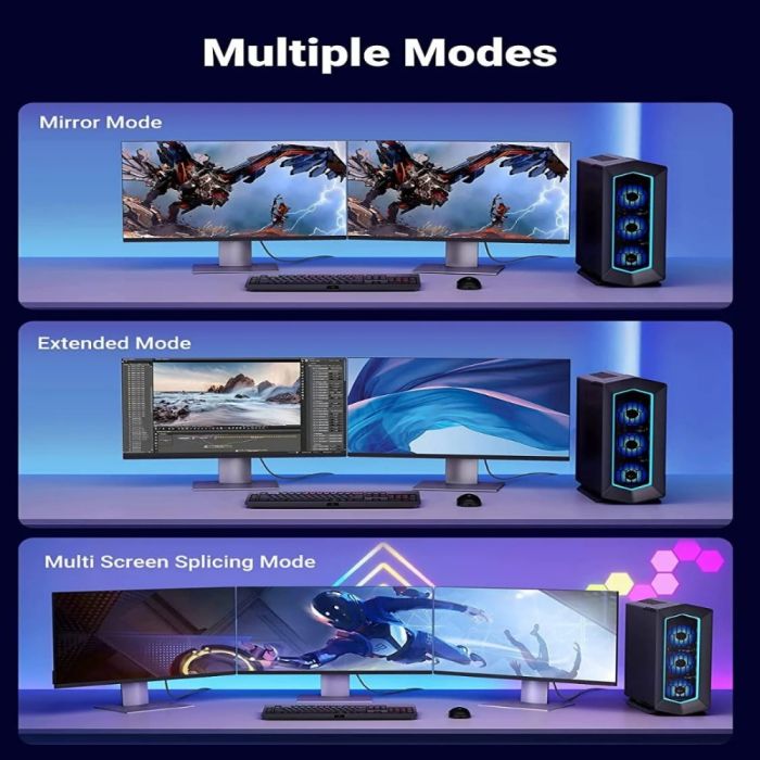 - يدعم حتى 8K (7680 × 4320) عند 60 هرتز و4K (3840 × 2160) حتى 144 هرتز و2K حتى 165 هرتز حسب توافق الأجهزة.
