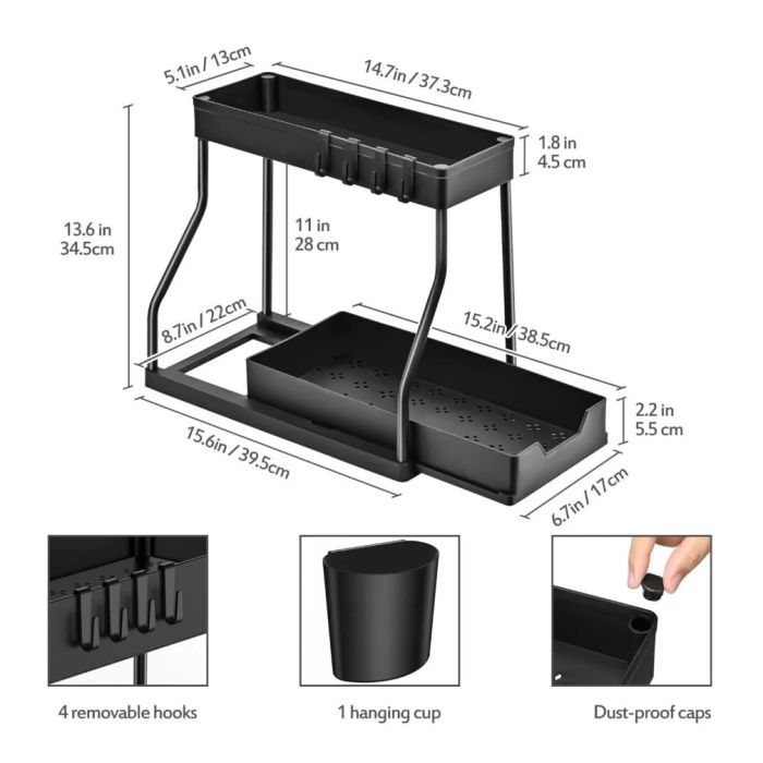 صُمم منظم أسفل الحوض على شكل حرف L، بجزء علوي ضيق وقاع عريض، مما يتيح مساحة للأنابيب أسفل الحوض ويستغلها على أكمل وجه. يمكن سحب الدرج السفلي للخارج، مما يُسهّل عليك وضع الأغراض المخبأة في الخلف دون عناء البحث. يأتي كل رف مع 4 علاقات قابلة للإزالة وكوب تعليق واحد لتخزين المزيد من الأدوات وتعليق الأغراض الصغيرة. لا حاجة لأدوات؛ التركيب في دقائق ولن يتلف الخزانة؛ سهل النقل، ويمكن فكه وتركيبه بشكل متكرر.