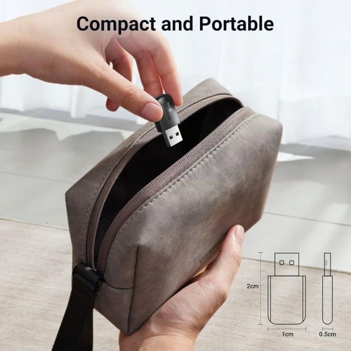 بسرعة تصل إلى 600 ميجابت/ثانية على نطاق 5 جيجاهرتز و287 ميجابت/ثانية على 2.4 جيجاهرتز. يدعم التوصيل ثنائي النطاق، التشفير الآمن WPA/WPA2، ويعمل على Windows 10 و11 بدون تعريفات. صغير ومحمول، ويتيح استقبال الإنترنت ومشاركته مع الأجهزة الأخرى بسهولة.