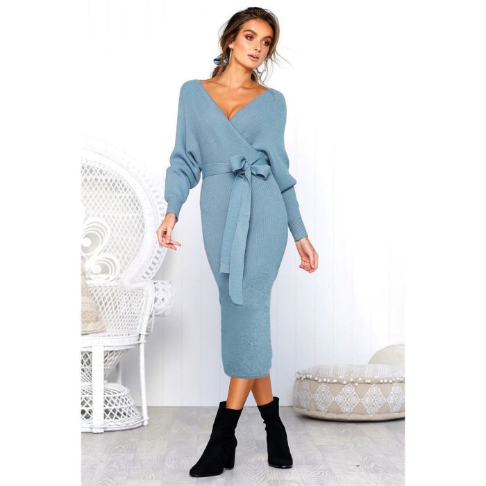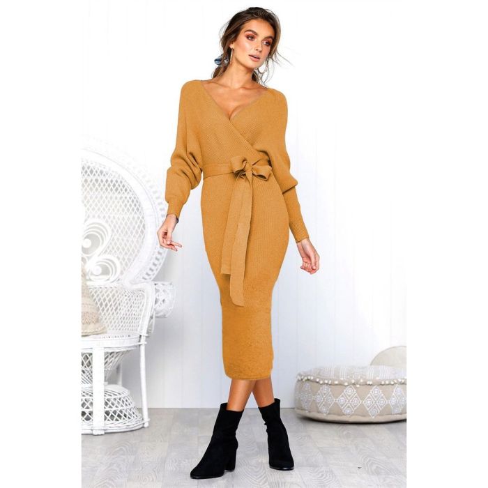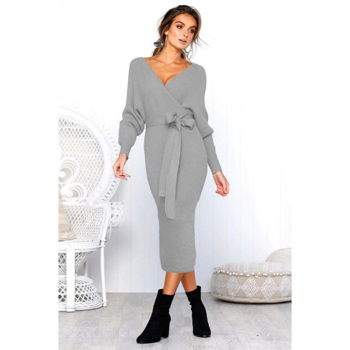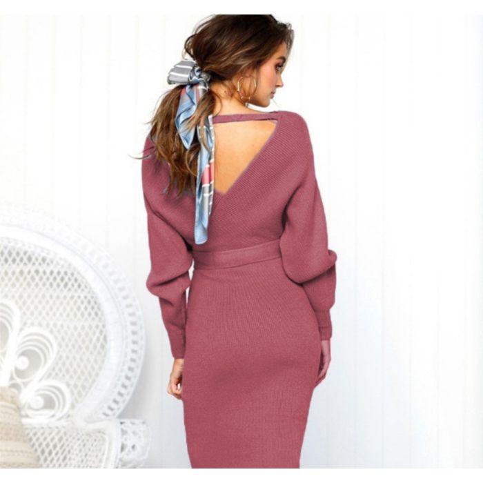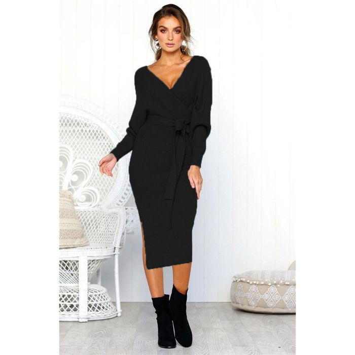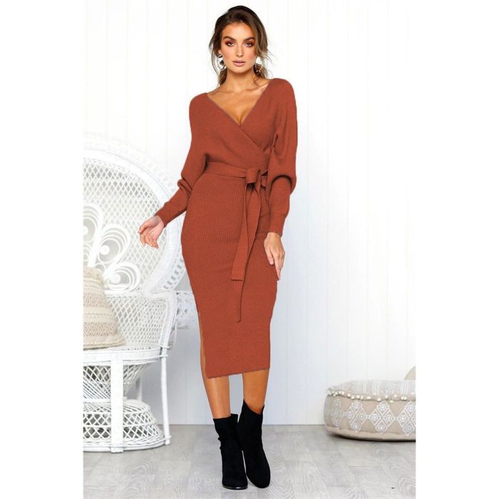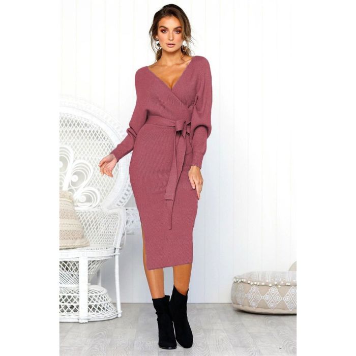 - فستان قصير بأكمام طويلة وفتحة رقبة على شكل حرف V للسيدات