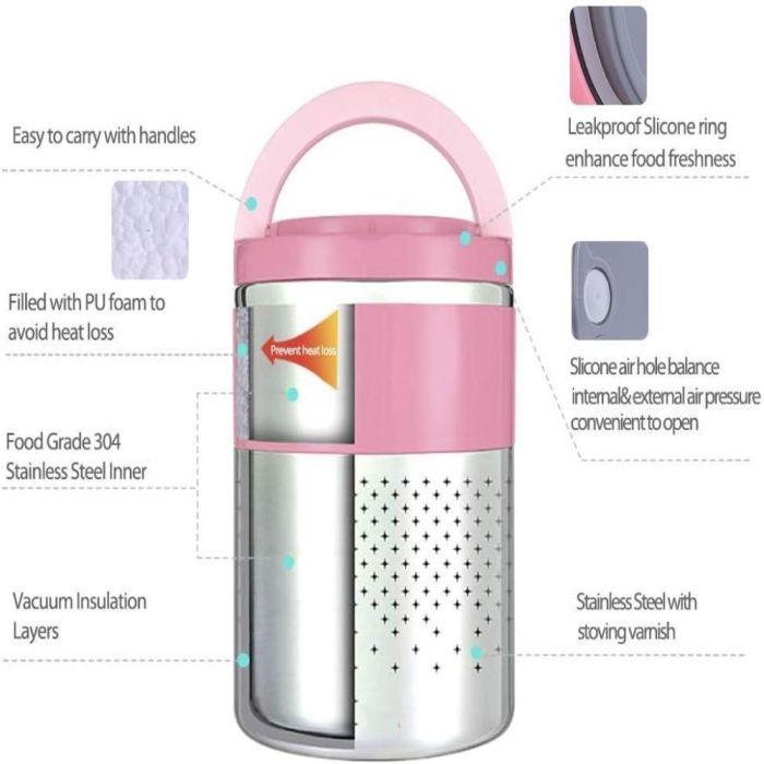 حافظ على وجباتك ساخنة وطازجة مع علبة الطعام المعزولة بتفريغ الهواء 2 طبقة. تتميز بتقنية عزل متطورة من أربع طبقات، مصممة للحفاظ على دفء الطعام لأكثر من ست ساعات، لتستمتع بوجبة شهية في المدرسة أو العمل أو أثناء التنقل. تضمن حلقتها المصنوعة من السيليكون المُحكمة الإغلاق تجربة مانعة للتسرب بنسبة 100%، مما يجعلها مثالية لحمل الحساء أو السوائل دون أي انسكاب.