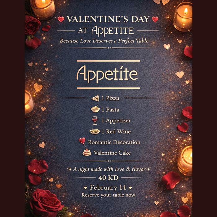 احتفلوا بالحب مع قائمة خاصة لليلة الفالنتين لشخصين في مطعم وكافيه أبيتايت. أجواء رومانسية، أطباق شهية، وتجربة عشاء لا تُنسى.