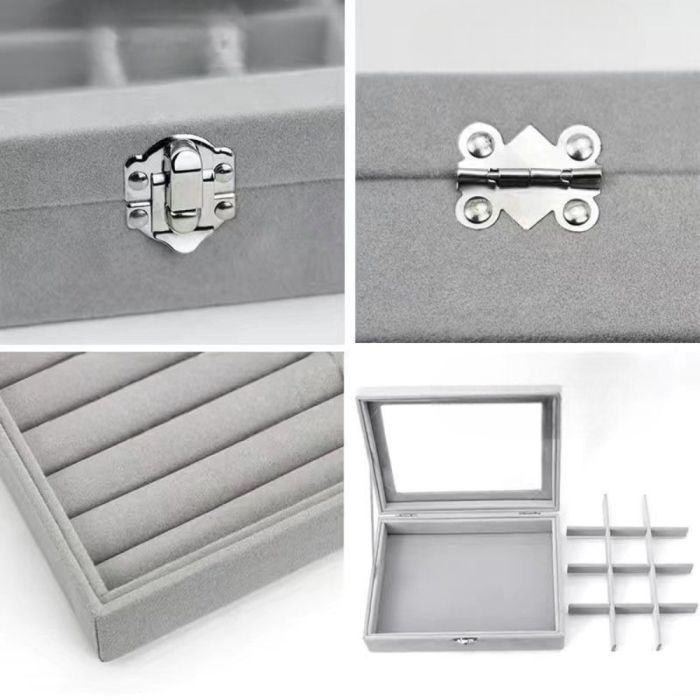 منظم مجوهرات مخملي بغطاء شفاف مصنوع من خامات أنيقة، يوفر تقسيمات داخلية لحفظ الخواتم والأقراط والقلائد، تصميم شفاف لسهولة رؤية المحتويات، يحافظ على تنظيم القطع ويحميها من الغبار بطريقة أنيقة وعملية