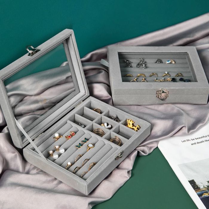 نظّمي إكسسواراتك الثمينة في صندوق المجوهرات المخملي الأنيق هذا. بغطاء زجاجي شفاف وأقسام متعددة، هو الحل الأمثل لتخزين وعرض مجموعتك بأسلوب عصري.