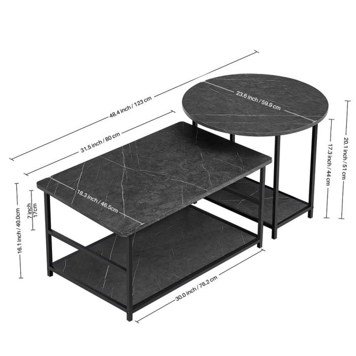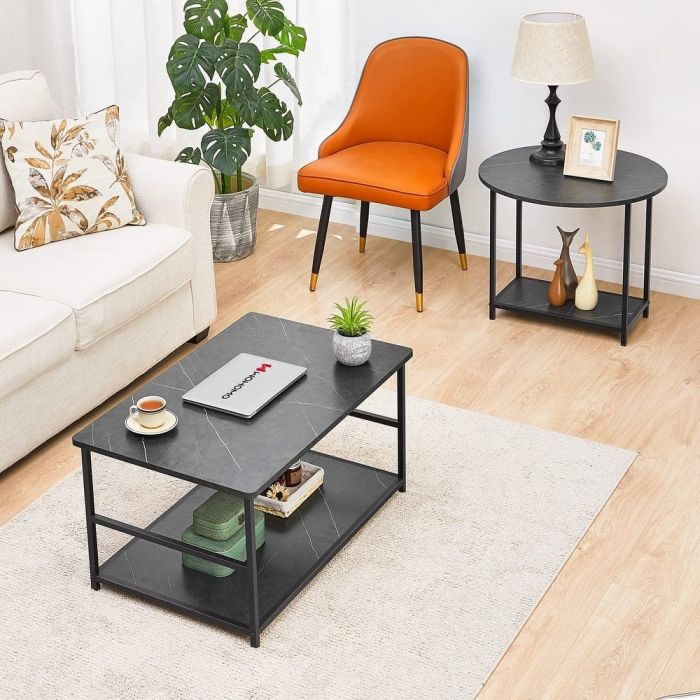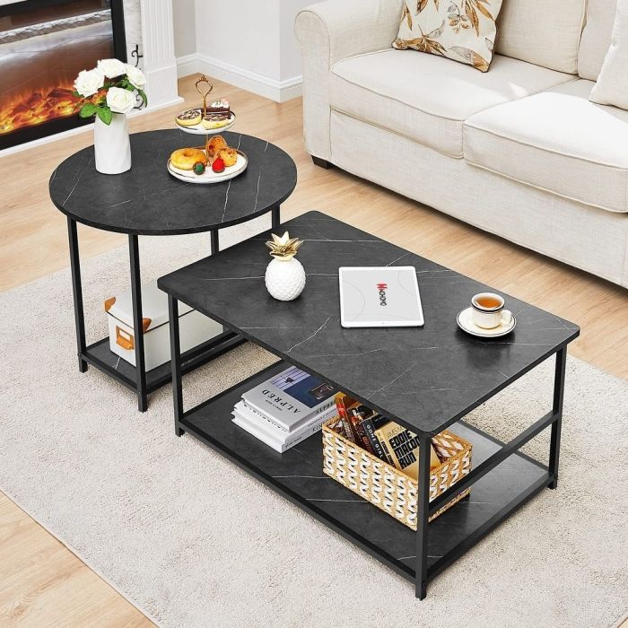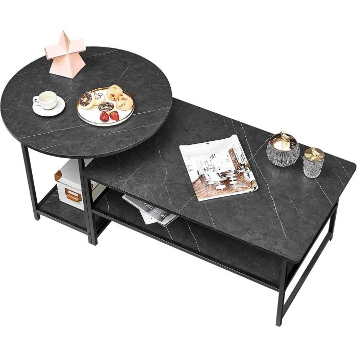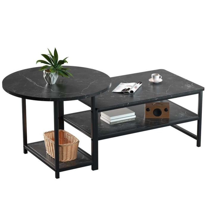 جدّد ديكور غرفة المعيشة مع طاولة القهوة العصرية. تصميمها القابل للفصل يمنحك طاولة مستطيلة صغيرة وطاولة جانبية دائرية، مما يوفر مرونة في الترتيب حسب الحاجة. سطحها المصنوع من الرخام الصناعي باللون الأسود مع إطار معدني يضفي لمسة راقية، بينما توفر الرفوف المفتوحة ذات المستويين مساحة مثالية لتخزين الكتب أو الإكسسوارات اليومية. سواء استخدمتها كقطعة واحدة أو فصلتها، فهي تجمع بين الأناقة والعملية.