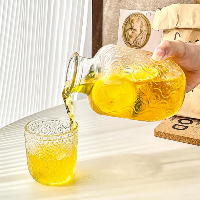 - الطقم يشمل: إبريق مياه + كوب زجاجي متناسق