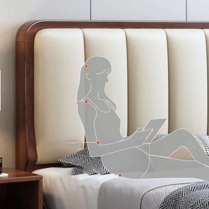 سرير من خشب الجوز مصنوع من هيكل خشبي متين مع ظهر مكسو بجلد ناعم، يمنحك دعماً مريحاً عند الاستناد، تصميم متوازن مع مساحة تخزين مخفية، وتفاصيل راقية تضيف فخامة هادئة لغرفة النوم