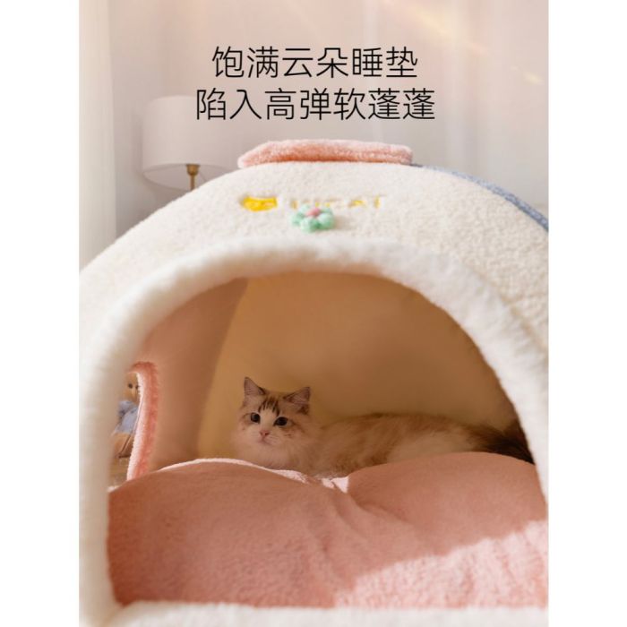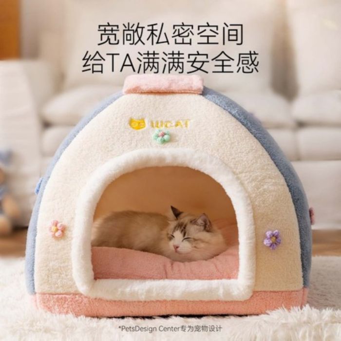 بيت للحيوانات الأليفة شتوي دافئ بتصميم خيمة مصنوع من خامات ناعمة سميكة، يوفر عزلاً مريحاً من البرد، تصميم مغلق يمنح إحساساً بالأمان، مناسب للنوم والاسترخاء داخل المنزل