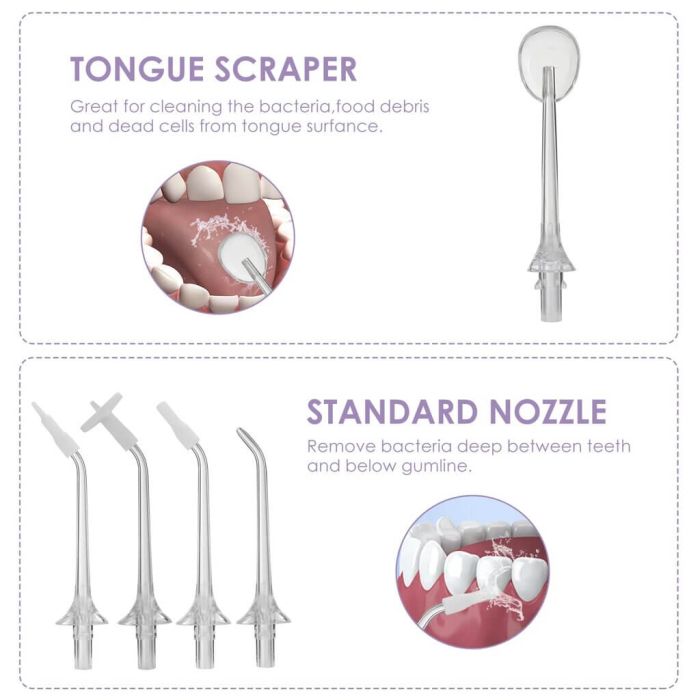 - يمكن لتصميم الفوهة القابل للدوران بزاوية 360 درجة أن ينظف الأسنان بشكل شامل من زوايا متعددة ويمنع تسوس الأسنان، ترسبات الأسنان، حصى الأسنان، نزيف اللثة وفرط حساسية الأسنان
