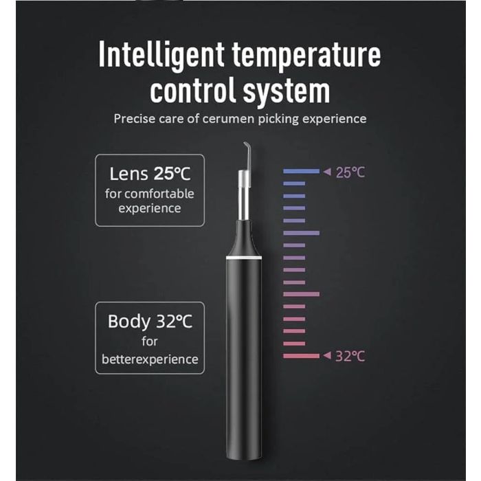 - رأس إزالة شمع الأذن المصنوع من الفولاذ المقاوم للصدأ مقاوم للماء، لذا يُمكنك مسحه بمنشفة رطبة بعد كل استخدام لضمان النظافة. عند استخدام أداة إزالة شمع الأذن، ترتفع درجة حرارتها تدريجيًا ثم تُحافظ عليها، مما يجعلها مناسبة أكثر للآذان الحساسة.