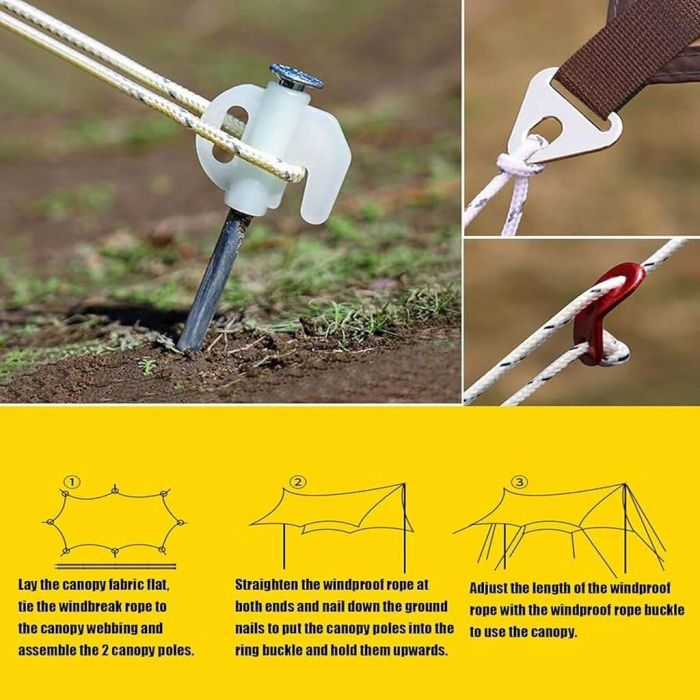 - تتضمن حبالاً وأعمدة وأوتاداً للتركيب السريع