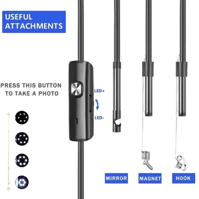 منظار فحص عملية للوصول إلى الأماكن الضيقة وتحت الماء بسهولة. مزودة بإضاءة LED قابلة للتعديل وكيبل طويل، لتمنحك رؤية واضحة أثناء أعمال الصيانة والفحص، سواء للاستخدام المنزلي أو الاحترافي.