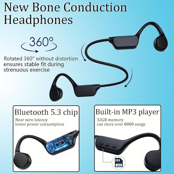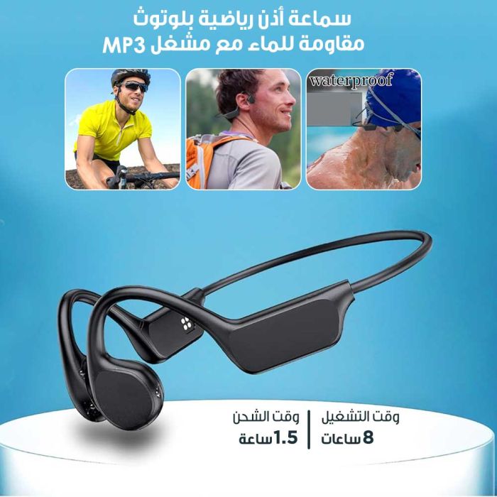 سماعة أذن بتصنيف IP68 المقاوم للماء والتي يمكنها تحمل الغمر الكامل في الماء حتى 2 متر، وهي مصممة للسباحة ويمكن استخدامها مع قبعة السباحة والنظارات وسدادات الأذن في نفس الوقت، يسمح لك الوضع المزدوج بالتبديل بحرية من وضع MP3 إلى وضع البلوتوث، كما أنها مزودة بأحدث شريحة بلوتوث 5.3 وميكروفون مدمج يمكنه الاتصال بالبلوتوث أو تلقي مكالمة عند ممارسة الرياضات مثل الجري وركوب الدراجات والتدريب والمشي