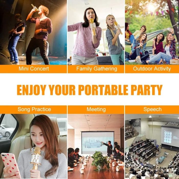 بلغني عند التوفراذا كنت من محبي الاحتفالات مع العائلة والاصدقاء فهذا المايكروفون هو الاختيار الافضل للغناء يمكنك الغناء وسماع صوتك مباشرة من المكبرات المدمجة وتغيير قوة الصدى والصوت وتوصيل فلاش USB.