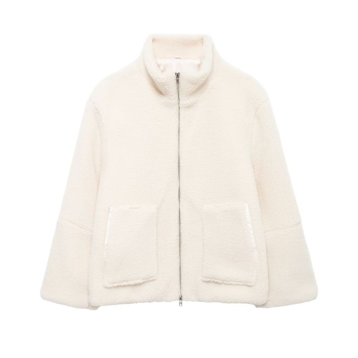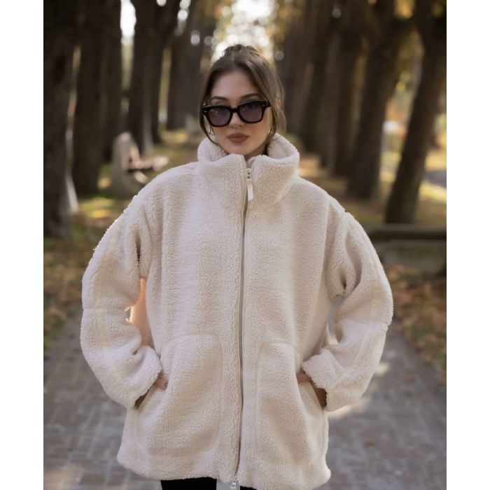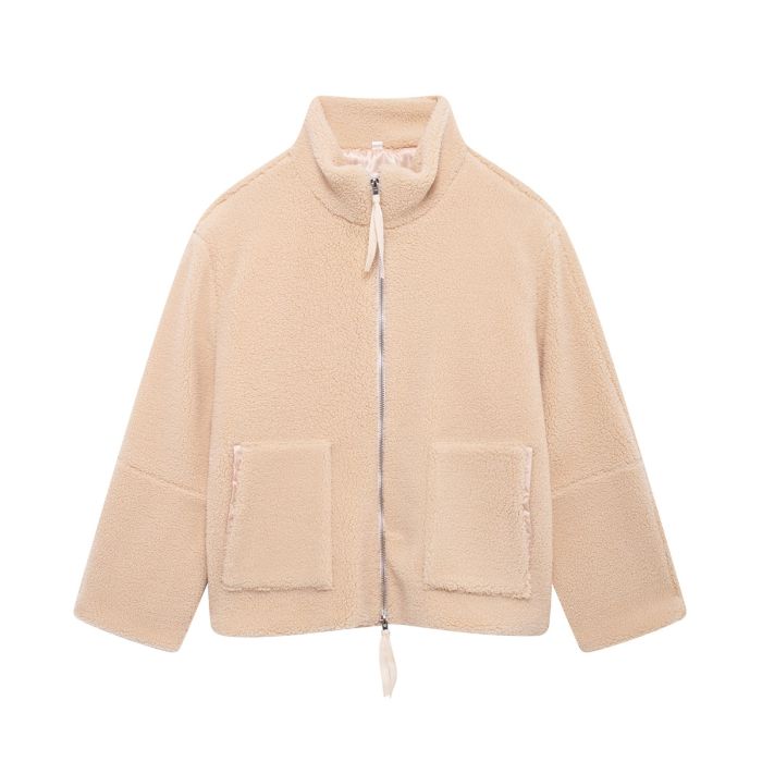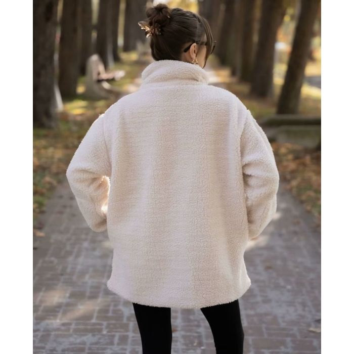 جاكيت نسائي دافئ بخامة صوفية وفرو الخروف، بلون صلب وتصميم مريح، مثالي للخريف والشتاء.صفقة اليوم هي سترة نسائية فرو بياقة مدورة