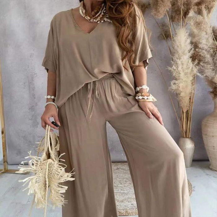 - طقم أنيق ببلوزة بياقة V وبنطلون واسع الساق