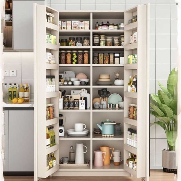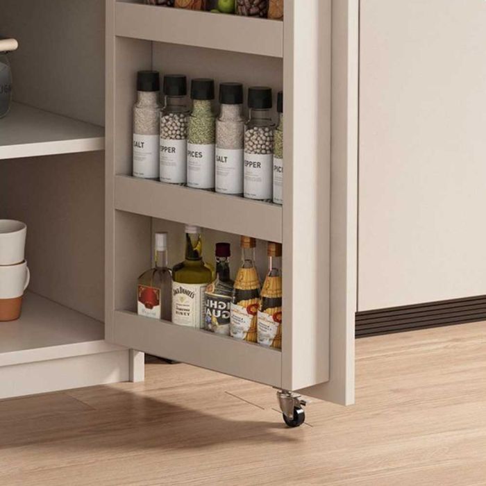 - منظم مطبخ من خشب هندسي مع باب مزدوج بعجلات