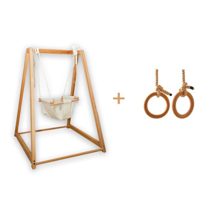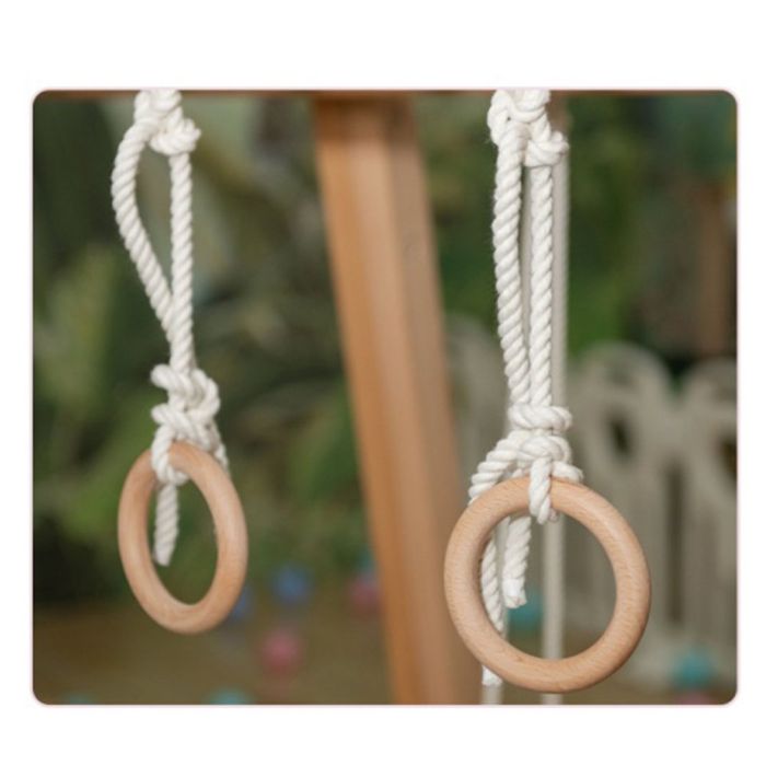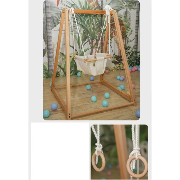 ارجوحة خشبية للأطفال مع مقعد قماش وحلقات تعليق مصنوعة من خشب متين بتشطيب آمن، تصميم ثابت يدعم اللعب والحركة، تساعد على تنمية التوازن وقوة اليدين، مناسبة للاستخدام داخل المنزل، تمنح تجربة لعب ممتعة مع الحفاظ على جودته