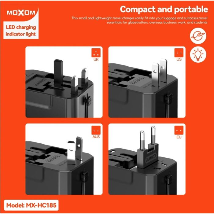 حل مدمج ومتعدد الاستخدامات لجميع احتياجات الشحن في جميع الدول. متوافق مع أنواع مختلفة من المقابس، يضمن الاستخدام السلس في أكثر من 170 دولة. مزود بمنافذ USB-C و USB-A ، يتيح شحن عدة أجهزة في وقت واحد، مما يجعله رفيقًا أساسيًا أثناء السفر