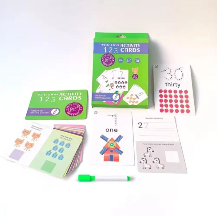 تتميز كل بطاقة برسومات نابضة بالحياة تُأسر عقول الصغار وتُنمّي مهارات أساسية مثل التعرّف على الأرقام والعدّ والكتابة.